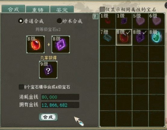 玩家心血来潮准备三块八级宝石想合一块九级宝石,机会2次,然后上演了一发入魂。