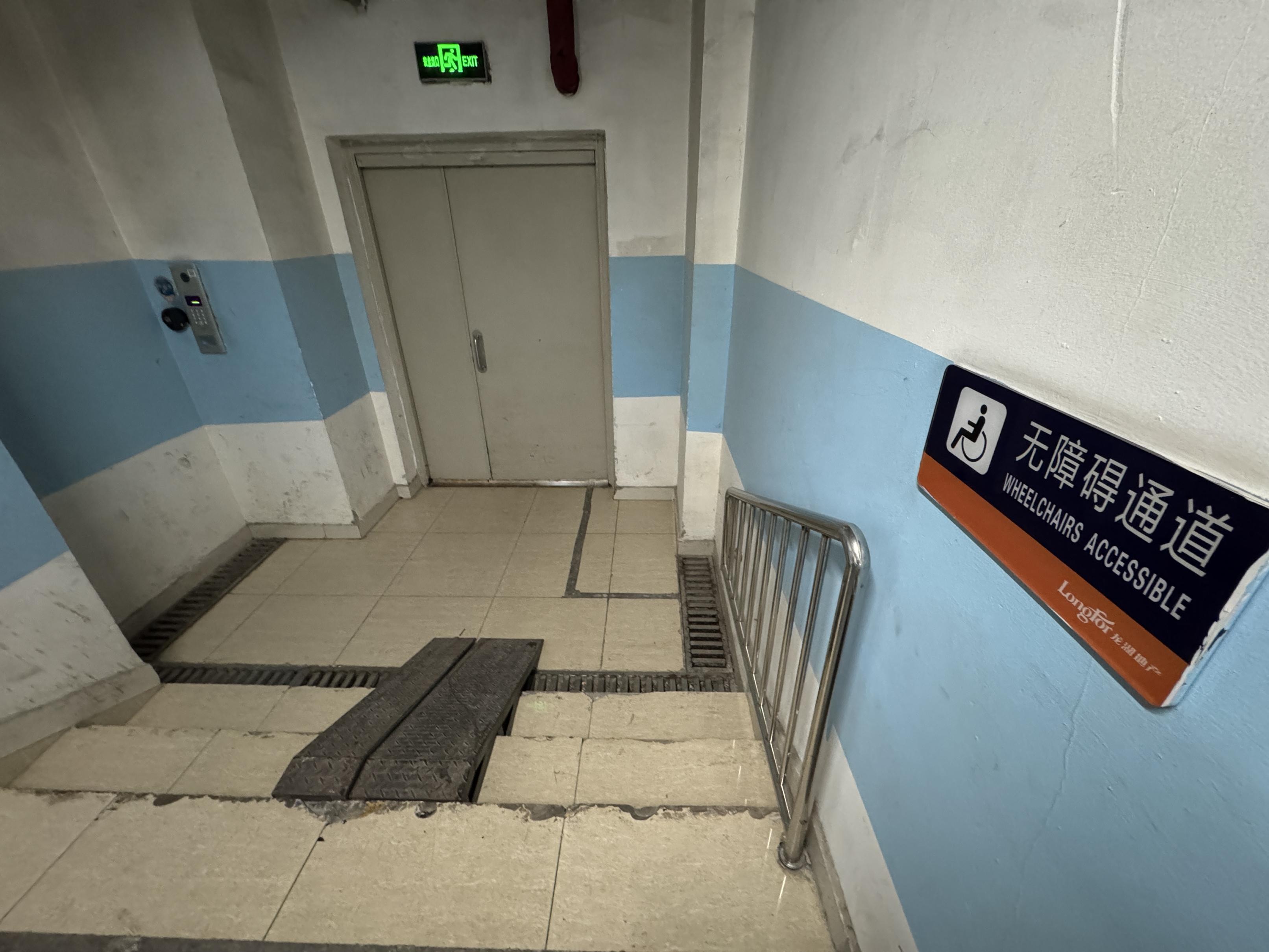 这样的简易坡道不仅没起到“无障碍”作用,反而成了电梯厅进出口的障碍。王女士说:“需要无障碍通道的人不敢用、用不上,不需要无障碍通道的人又嫌钢板占地儿、碍事儿。坡道能不能改造一下?”