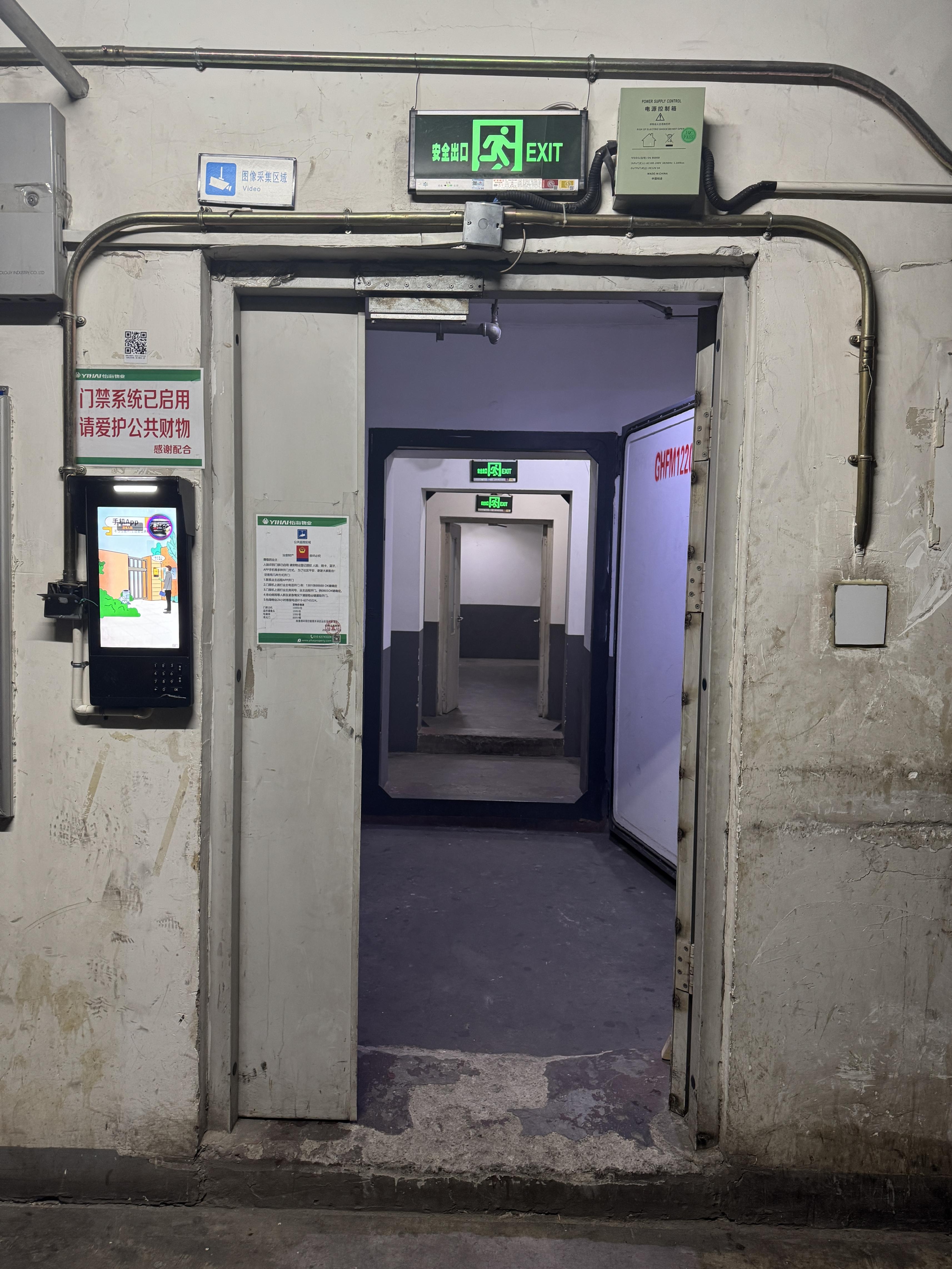 近日记者来到现场探访。出电梯厅来到B2层,有一段连廊通往地库,这条几米长的连廊连续设置了三道门——两道人防门、一道防火门。每扇门都有高约10厘米的门槛。