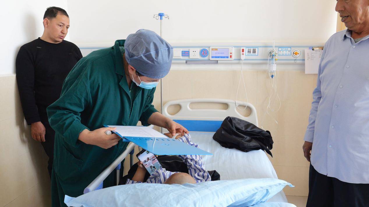 他向记者诉说了一家人的困境:自己的儿子也是听障人士,孙子出生后一直跟着他和老伴儿生活。在孩子三岁时,因为老伴儿生病,无力照顾萨吾提,便将他送回父母身边。后来慢慢地发现孙子不说话,好像也听不到了。无声的屏障让这个家庭承受着诸多不便。“山东专家们来免费给孩子做手术。孩子以后学习、生活会越来越好起来!”朴素的话语,道尽了老人对萨吾提未来生活的期待。