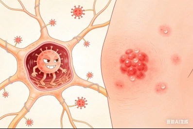 图片来源于豆包AI睡了几十年的病毒突然醒了!几乎每个成年人体内都住着水痘-带状疱疹病毒。3小时候得完水痘,病毒并没离开,而是在神经节里悄悄潜伏下来,一住可能就是几十年。4等到年纪渐长、劳累疲惫、免疫力不小心“打个盹”的时候,病毒就会苏醒,顺着神经爬到皮肤上引发一串串灼痛的水疱和红疹。4