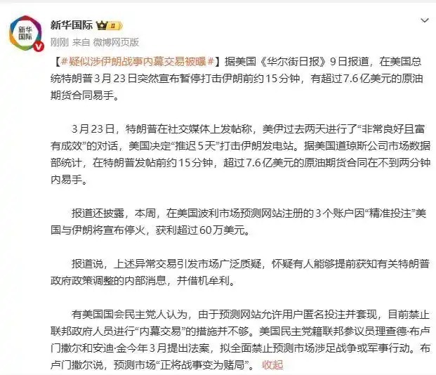 据美国《华尔街日报》9日报道,在美国总统特朗普3月23日突然宣布暂停打击伊朗前约15分钟,有超过7.6亿美元的原油期货合同易手。3月23日,特朗普在社交媒体上发帖称,美伊过去两天进行了“非常良好且富有成效”的对话,美国决定“推迟5天”打击伊朗发电站。据美国道琼斯公司市场数据部统计,在特朗普发帖前约15分钟,超过7.6亿美元的原油期货合同在不到两分钟内易手。报道还披露,本周,在美国波利市场预测网站注册的3个账户因“精准投注”美国与伊朗将宣布停火,获利超过60万美元。报道说,上述异常交易引发市场广泛质疑,怀疑有人能够提前获知有关特朗普政府政策调整的内部消息,并借机牟利。有美国国会民主党人认为,由于预测网站允许用户匿名投注并套现,目前禁止联邦政府人员进行“内幕交易”的措施并不够。美国民主党籍联邦参议员理查德·布卢门撒尔和安迪·金今年3月提出法案,拟全面禁止预测市场涉足战争或军事行动。布卢门撒尔说,预测市场“正将战事变为赌局”。
